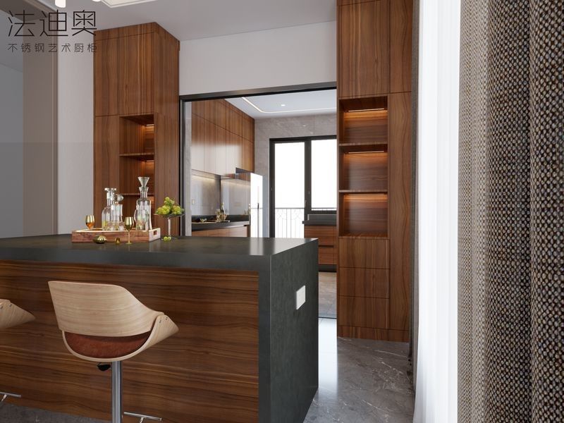 Luxurious, Refined, And Resilient Light Brown Wood Grain Stainless Steel Cabinetry - the collection’s latest Chinese-style stainless steel kitchen design with room context