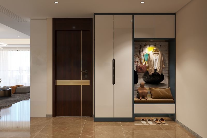Este armario de zapatos se presenta como un sistema basado en el diseño en lugar de un SKU genérico.Utiliza el blanco junto con la estructura del gabinete de acero inoxidable para crear una identidad visual más resuelta para proyectos residenciales premium.