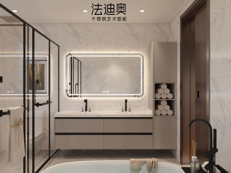 | P: ¿Este tocador de baño moderno de acero inoxidable duradero y elegante admite electrodomésticos integrados o características de exhibición? Sí. La página actual ya hace referencia a la integración de electrodomésticos y Amplio espacio para toallas, artículos de tocador y otros elementos esenciales, con estanterías abiertas y compartimentos ocultos., lo que ayuda a los equipos de adquisiciones a juzgar si el lenguaje de diseño puede extenderse a unidades altas, islas y zonas destacadas. |