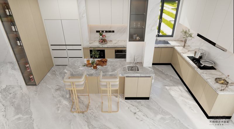 Este gabinete de cocina personalizado está construido en torno a una estrategia de acabado diferenciada: grano de madera / blanco emparejado con estructura de gabinete de acero inoxidable.Esa combinación da a los compradores una expresión de lujo más cálida sin perder la limpieza y la durabilidad del proyecto esperados de los gabinetes de acero inoxidable.