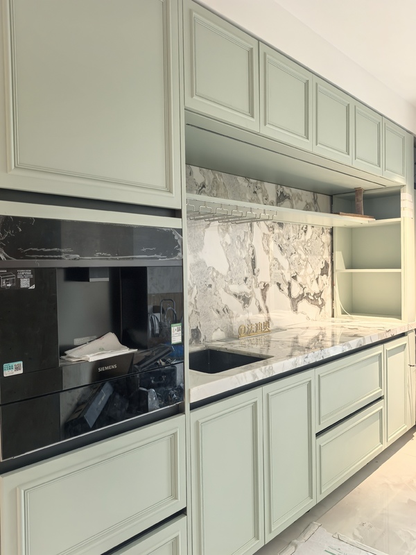 Este gabinete de cocina se presenta como un sistema dirigido por el diseño en lugar de un SKU genérico.Utiliza el color beige / verde junto con la estructura del gabinete de acero inoxidable para crear una identidad visual más resuelta para proyectos residenciales premium.