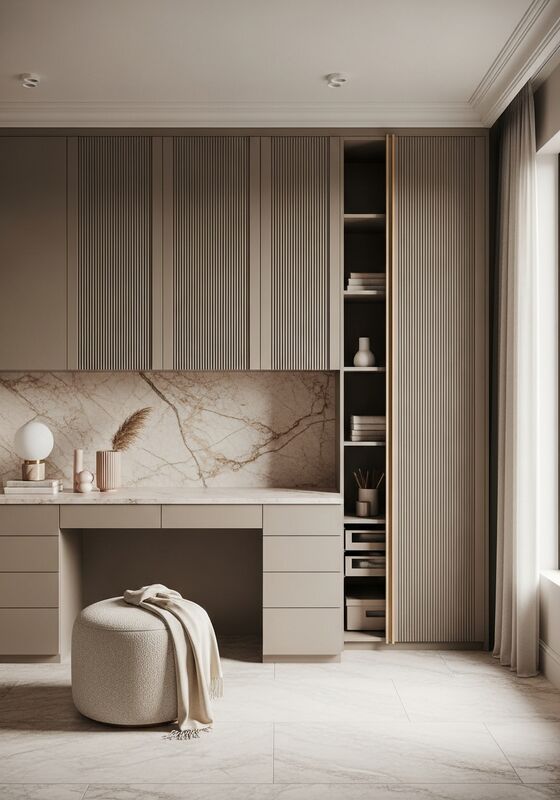 | Design Style | Soft feminine minimalism with architectural fluting detail, tonal warmth, zero visual clutter |