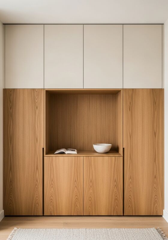 Fadior posiciona este armario de dormitorio como una solución de grado de proyecto construida alrededor de un sistema estructural de acero inoxidable de grado alimenticio 304; chapa de roble japonés natural con acabado mate aceitado; paneles de laca blanco cálido mate (plano de cáscara de huevo, superficie similar al papel); marco de acento de acero oxidado oscuro, veta recta, tono miel cálido, superficie mate aceitada, patrón de veta visible pero discreto, y una superficie superior a juego de piedra o acero para el sistema de armario principal del dormitorio para entornos residenciales que buscan lujo tranquilo, centrado en el almacenamiento y sin ruido visual; adecuado para habitaciones orientadas al este o al norte donde se valora la luz natural suave. Esta especificación se centra en la estructura central de acero inoxidable 304 con revestimientos de chapa de roble japonés natural en tono miel cálido, gabinetes superiores de laca blanco cálido mate acabados a mano con superficie plana de cáscara de huevo para que diseñadores, distribuidores y compradores de proyectos puedan evaluar el ajuste, el acabado y la lógica de entrega con menos conjeturas.