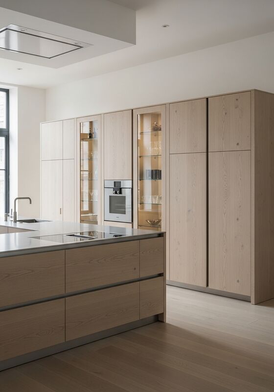 | Material y RendimientoEl sistema estructural de acero inoxidable de grado alimenticio 304 con chapa de roble blanco europeo de corte a la mitad (ultra mate, brillo casi nulo), paneles de acento de laca blanca mate (acabado de huevo), vidrio flotado transparente con bordes pulidos soporta la resistencia a la humedad, la estabilidad del acabado y el uso diario a largo plazo en cocinas residenciales de alta gama en casas diseñadas por arquitectos, residencias de coleccionistas de arte, espacios de vida adyacentes a galerías y proyectos que requieren gabinetes tranquilos y que maximizan la luz. Esto es importante cuando los compradores necesitan una apariencia arquitectónica sin el riesgo de mantenimiento a base de madera. |